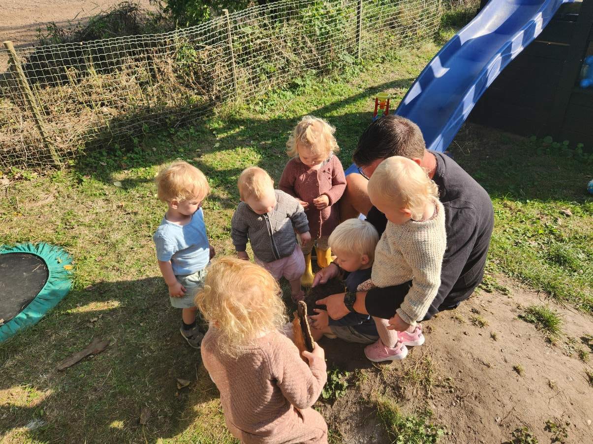 Sammen går vi nysgerrigt på opdagelse i udeliv og science. Det kan være blæsevejr, hoppe i vandpytter, følge høsten på marken, undersøge krible krable dyr og meget mere.